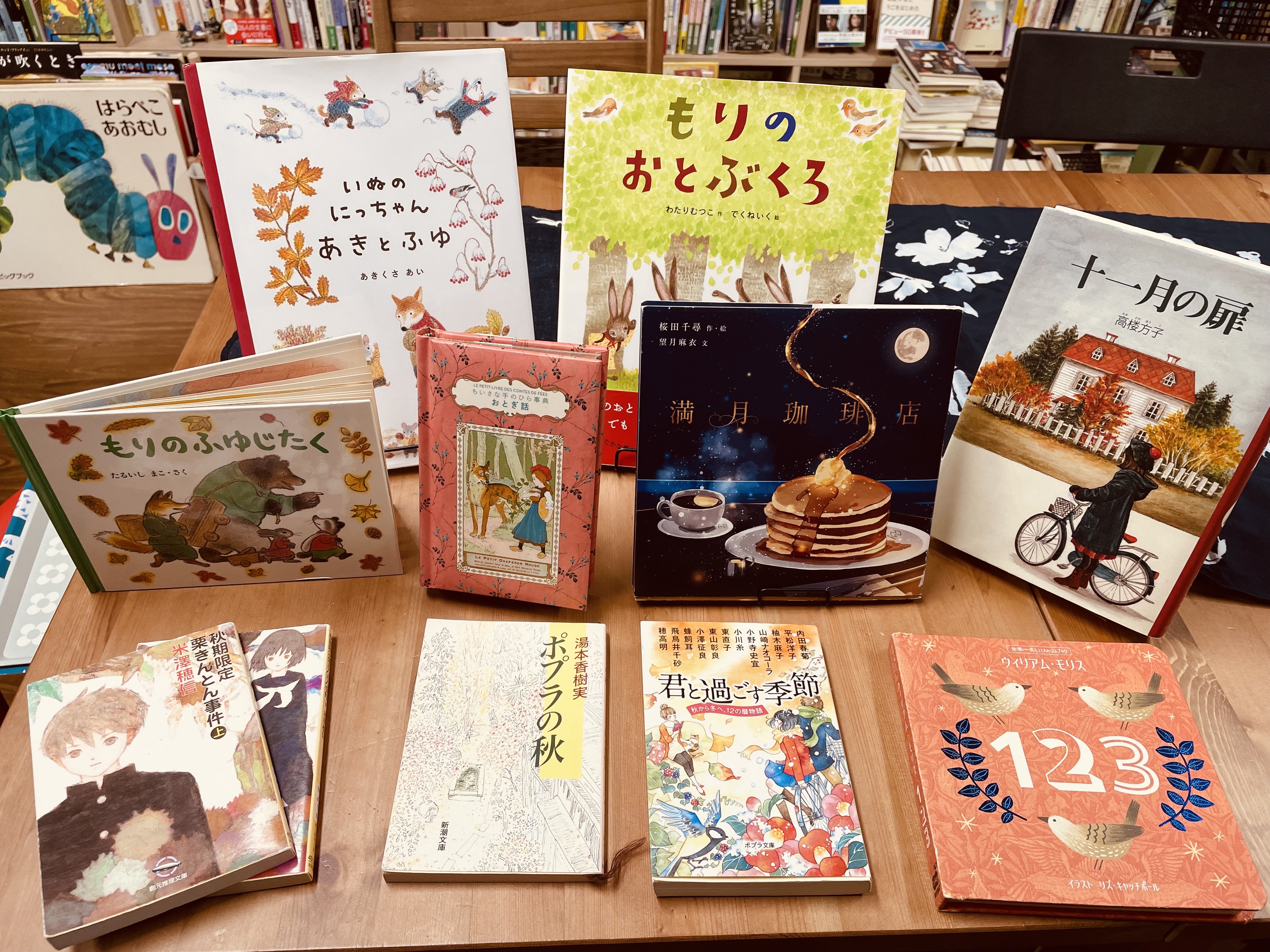 店内は、テーマ別に並ぶ50ほどの小さな棚や、児童書コーナー、季節に合わせた本のおすすめコーナーなどございます。気になる本を手に取り、座って選んでいただくこともできます。